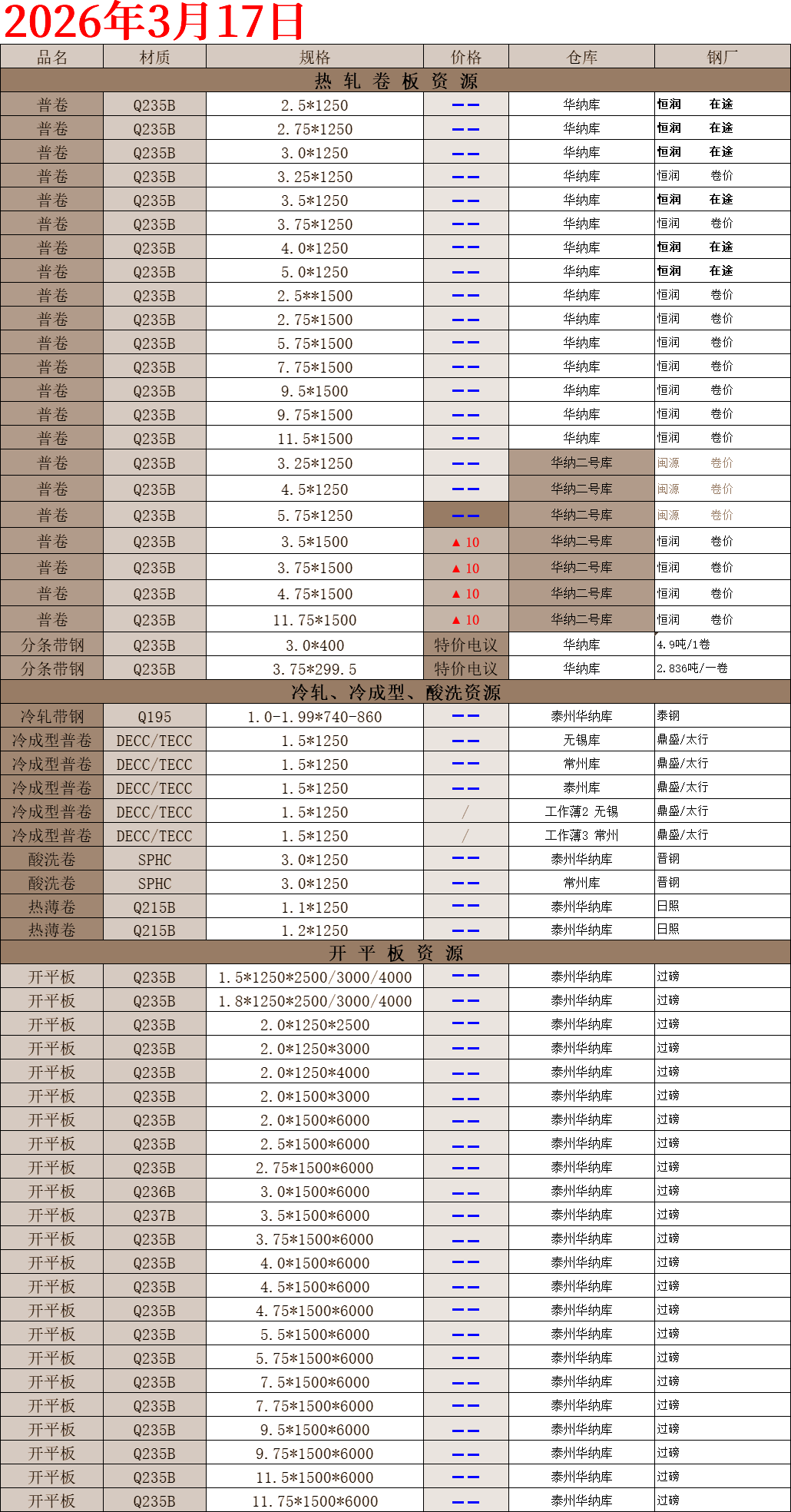 市场变化较快,实际成交价格以电询为准!报价说明 :以上卷板报价均为整件含开价,正常库存开平板出售+50需定开3米以上(包括3米)非整件+60,需定开2-3米非整件+70(包括2米),非整件小于1米-2米+80(包括1米),小于1米另计